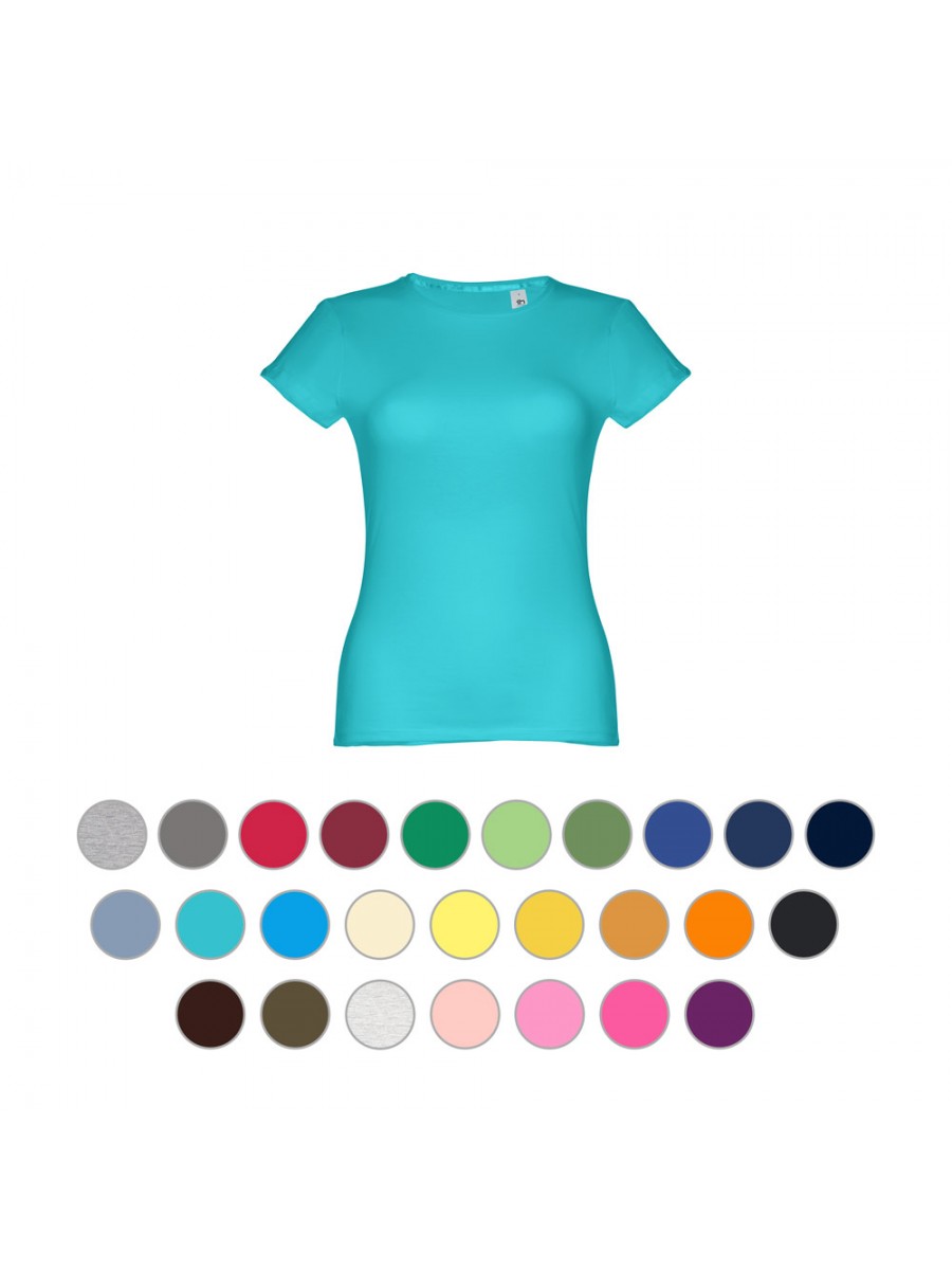 T-shirt aderente da donna in jersey di cotone 100% (150 g/m²) con filo in cotone cardato (colore: 183: 90% cotone/10% viscosa). Girocollo sottile in jersey con nastro di rinforzo in raso. Cuciture ribattute doppie sulle maniche e sull'orlo inferiore. Taglia: 3XL
