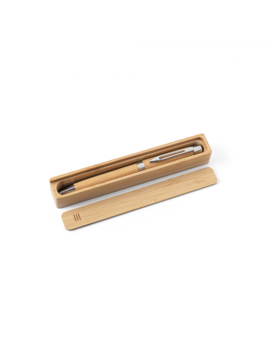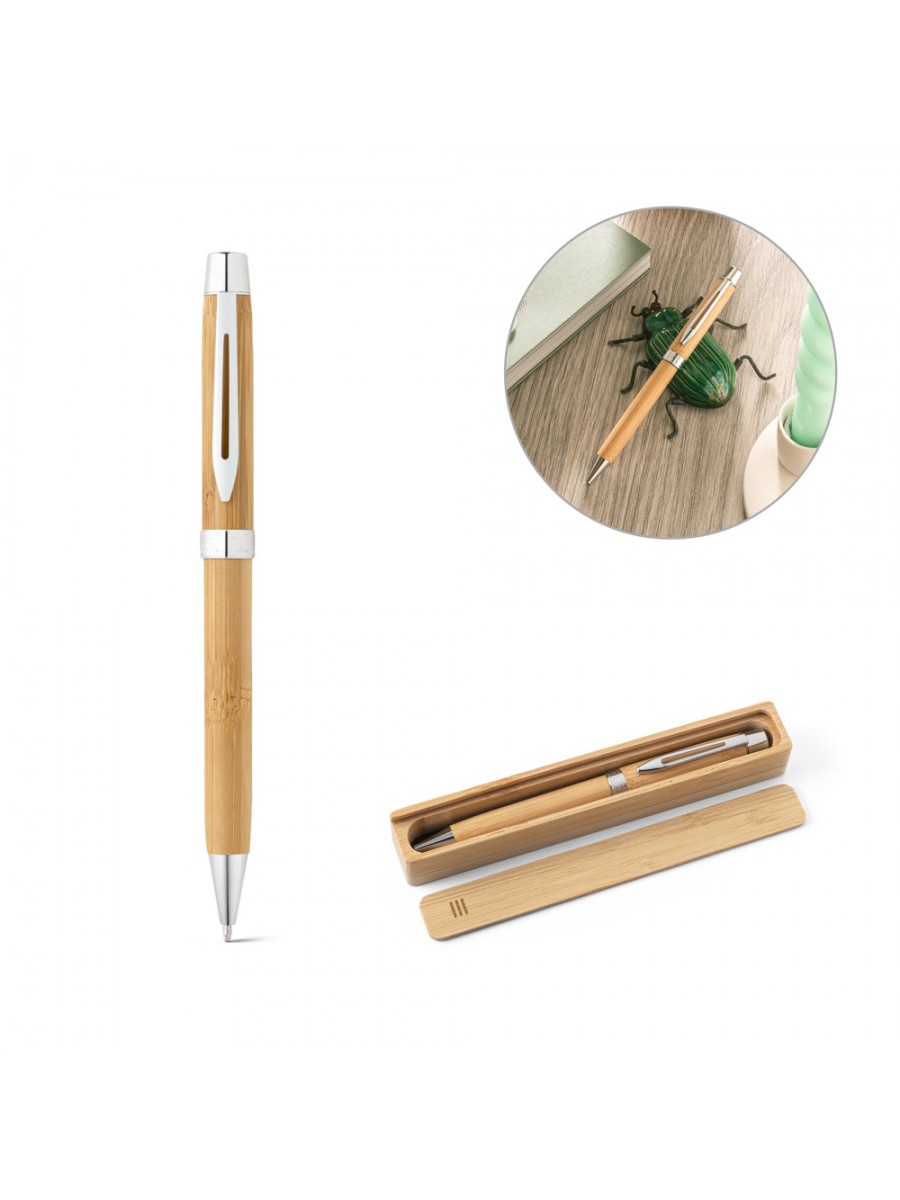 Penna a sfera in bambù con clip in metallo. La penna ha scrittura in blu e meccanismo a rotazione. Fornita in una confezione regalo in bambù con coperchio scorrevole e fascia in carta 100% riciclata. Poiché il prodotto è realizzato con materiali naturali, il colore del prodotto e il risultato della stampa possono variare da un prodotto all'altro. 24 x 152 x 23 mm