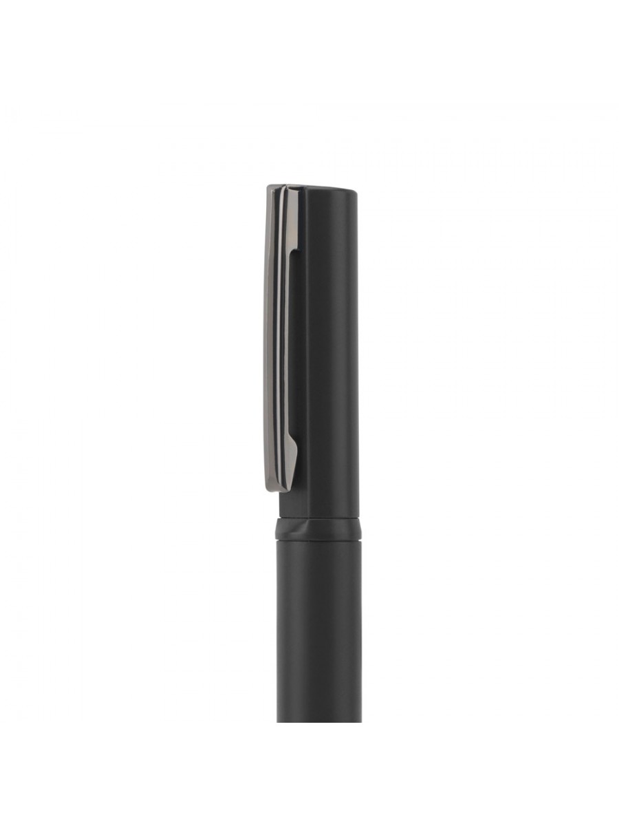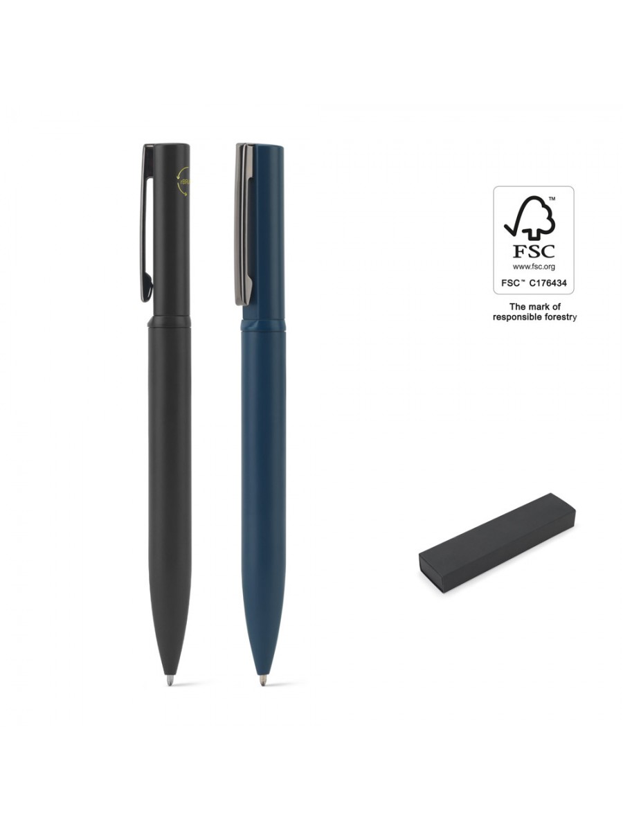 Penna a sfera elegante in metallo (60% riciclato), perfetta per valorizzare il tuo brand. Dotata di clip, meccanismo a rotazione e scrittura in blu. Fornita in confezione regalo in carta kraft certificata FSC™. Penna: ø12 x 138 mm | Astuccio: 170 x 40 x 22 mm