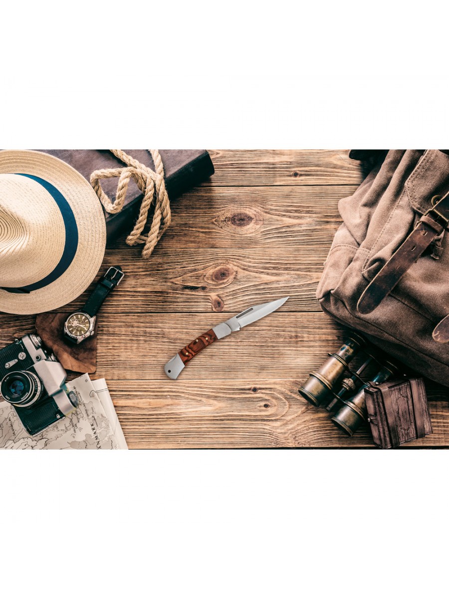 Coltellino tascabile in acciaio inox e legno con chiusura di sicurezza. Poiché il prodotto è realizzato con materiali naturali, il colore del prodotto e il risultato della stampa possono variare da un prodotto all'altro. 110 x 19 x 30 mm