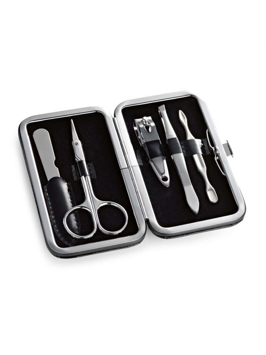 Set manicure di 5 pezzi con: lima, forbici, tagliaunghie, pinzette e spingi cuticole. Fornito in una custodia in PU. 110 x 65 x 20 mm