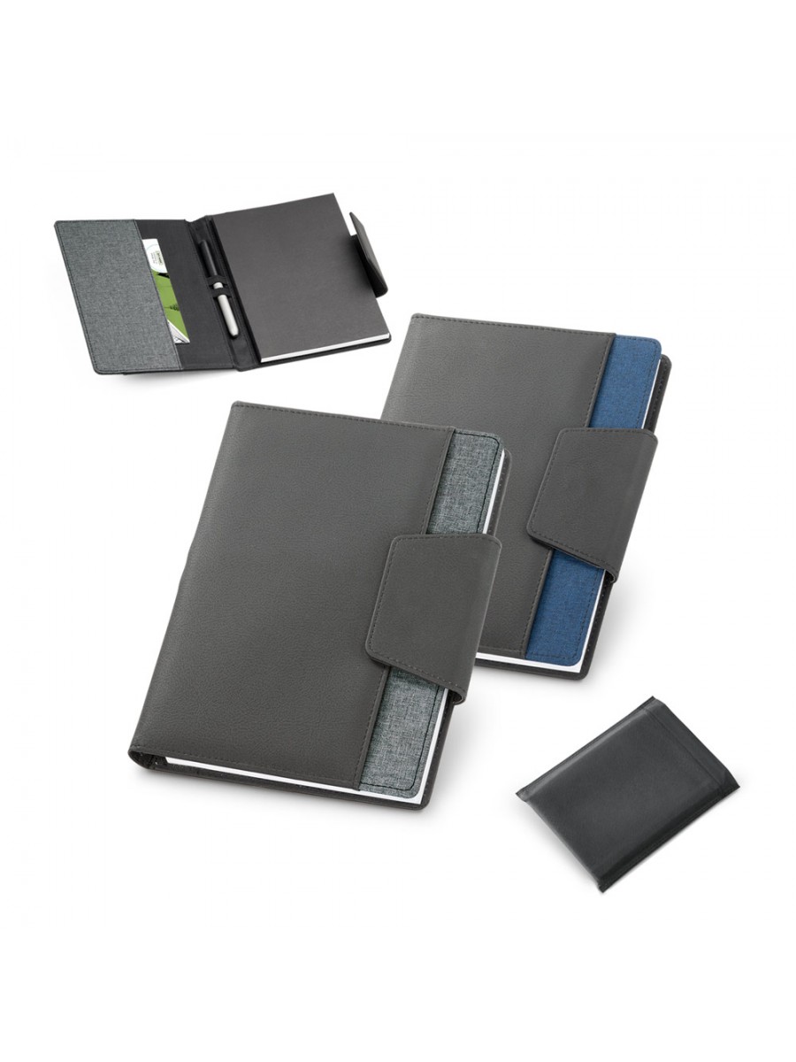 Copertina in PU e tessuto in poliestere, con block notes A5 all'interno. Presenta chiusura magnetica, tasca esterna, tasca interna e supporto per penna a sfera (non inclusa). Il taccuino rimovibile contiene 160 pagine lisce (70 g/m²), realizzato con materiale certificato FSC™ e altri materiali controllati. Fornito in una borsa in TNT. 155 x 215 mm | Custodia: 205 x 250 mm