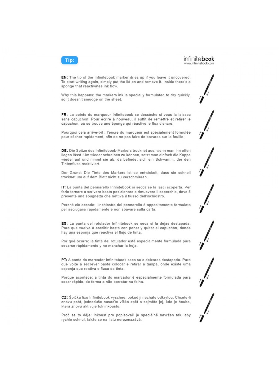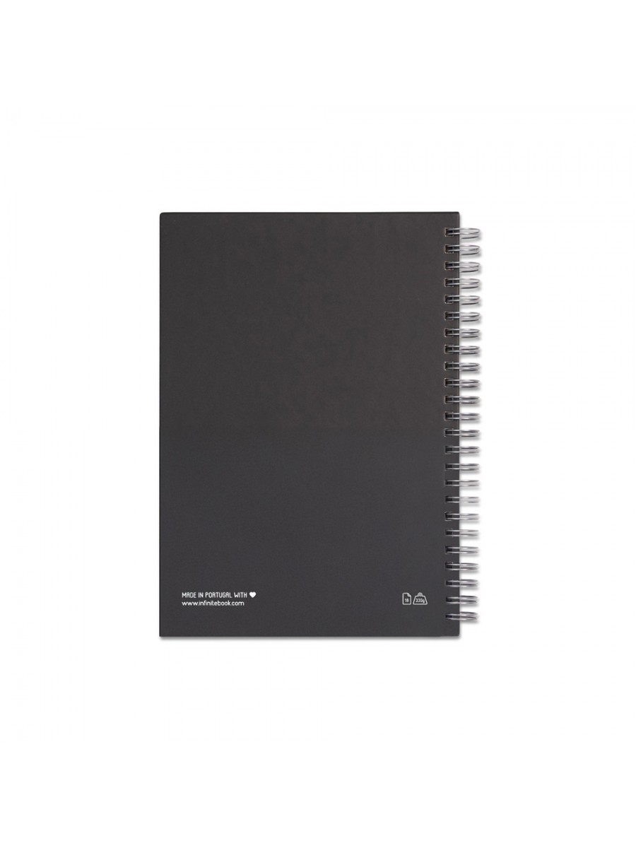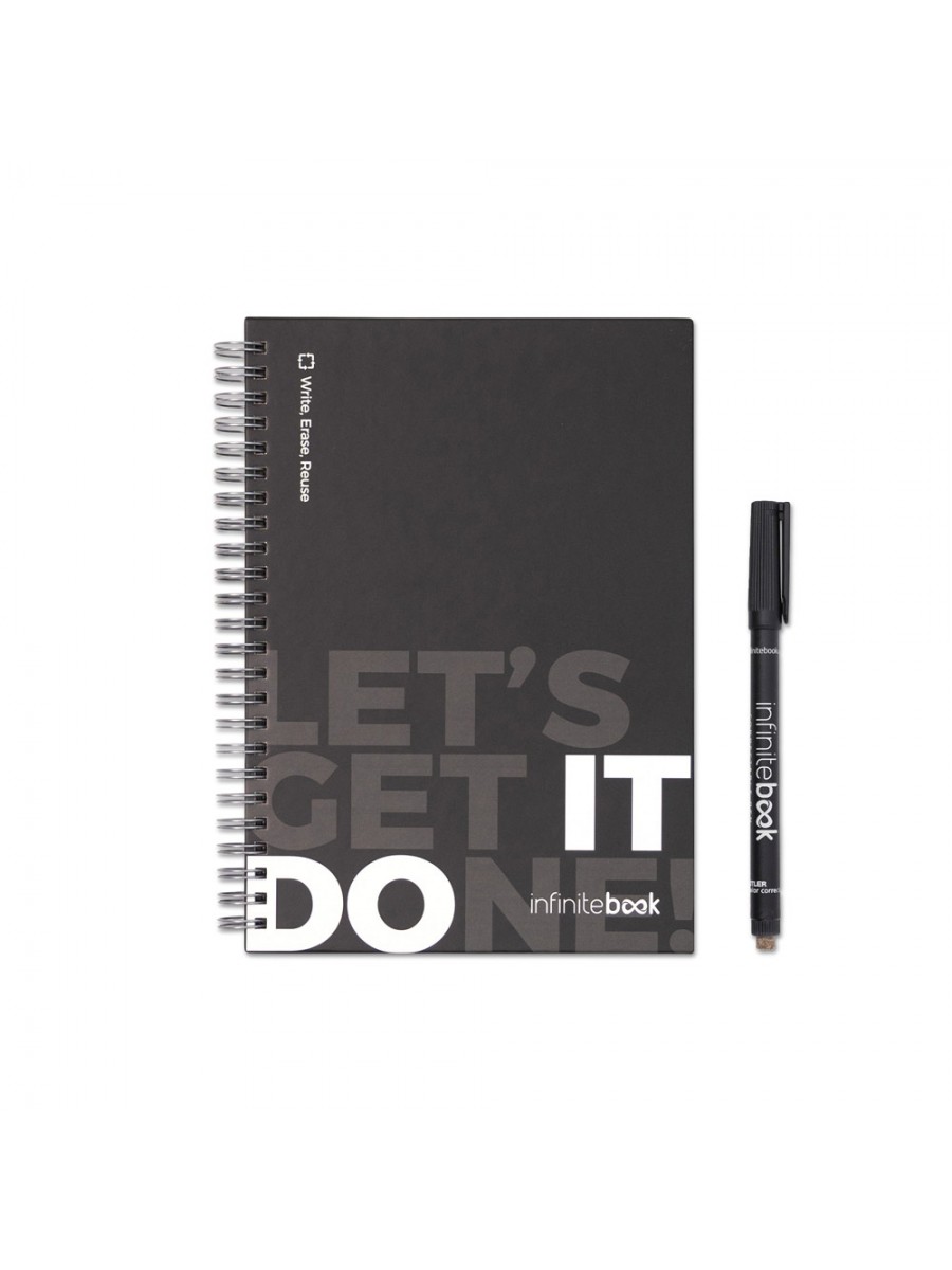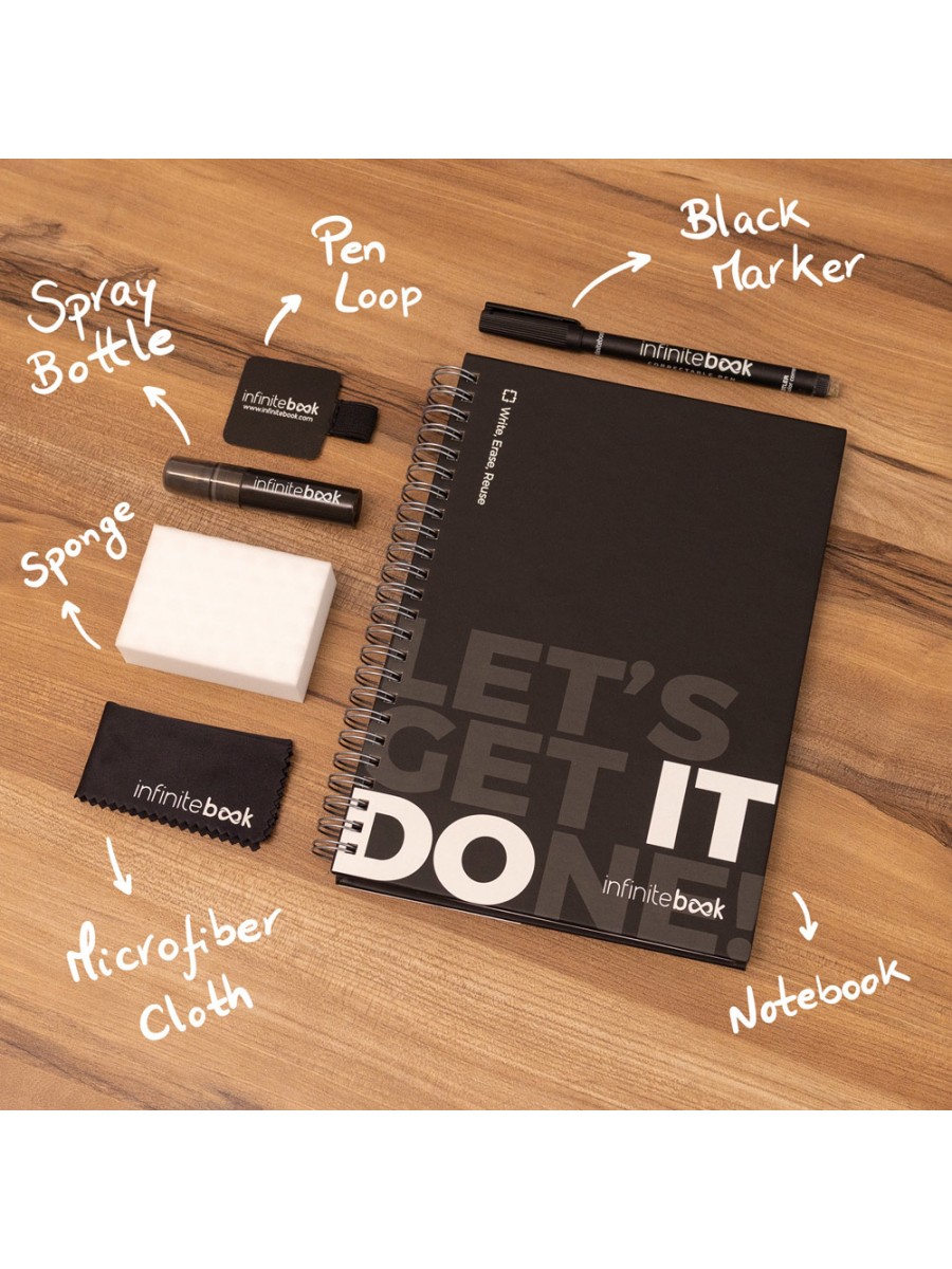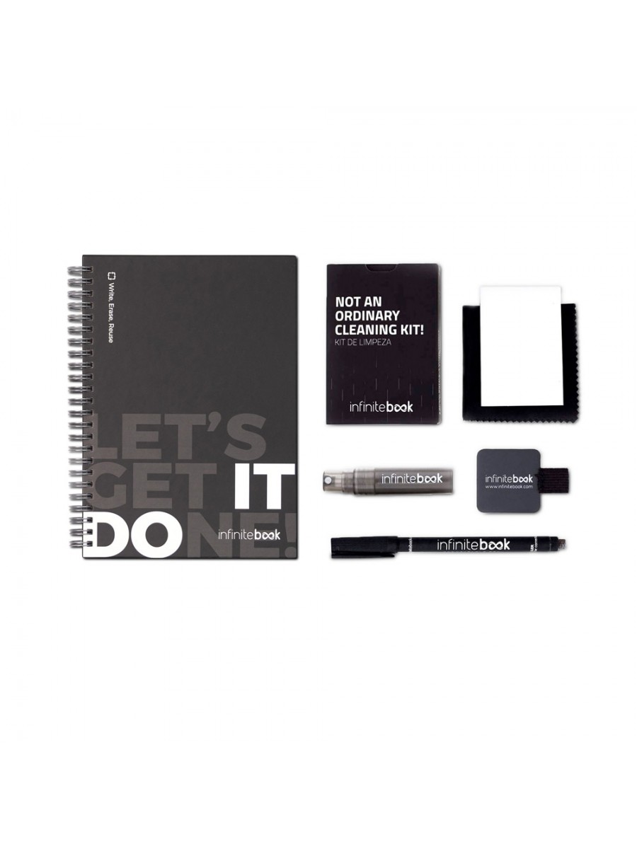 Il kit "Infinitebook" consente di cancellare facilmente tutto ciò che si scrive e di ricominciare il piano giornaliero tutte le volte che si vuole. Il kit contiene un quaderno "Infinitebook" con copertina rigida e spirale, un kit di pulizia (flacone spray vuoto, spugna e panno), un pennarello e un porta pennarello. Il quaderno ha 3 pagine per segnare le cose da fare, 3 pagine a puntini e 30 pagine bianche. Gli appunti possono essere digitalizzati. 148 x 210 mm