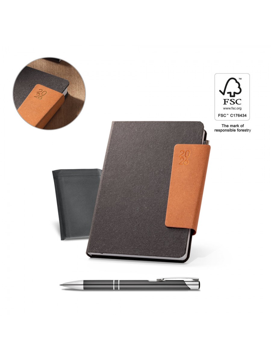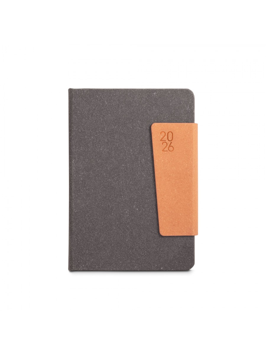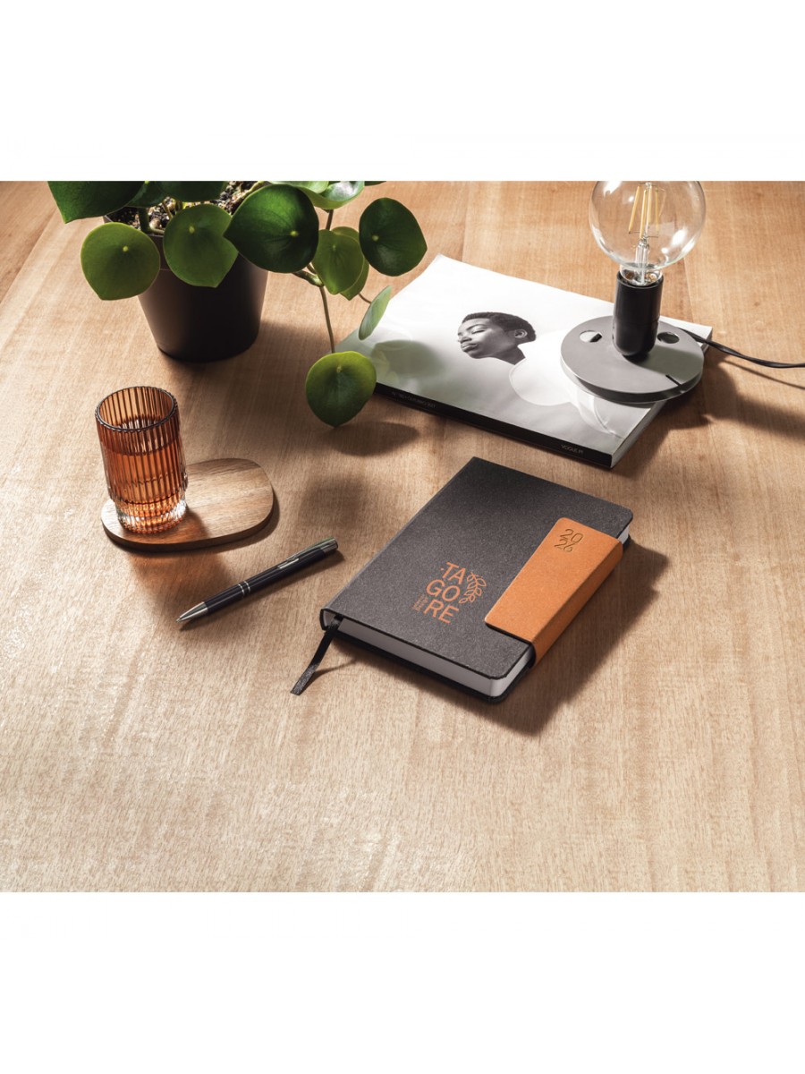 A5 diary in leather (58% recycled) with magnetic closure. It has a ballpoint holder (included) and ribbon marker. It is organised in a daily plan, with pages (70 g/m²) made from FSC™ certified material and other controlled materials. Supplied with a non-woven pouch. 148 x 210 mm | Pouch: 205 x 250 mm