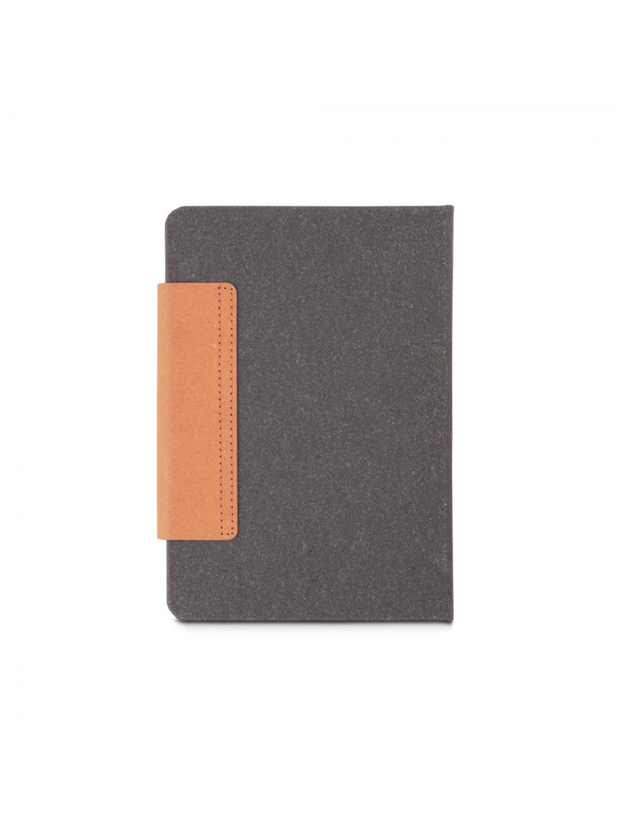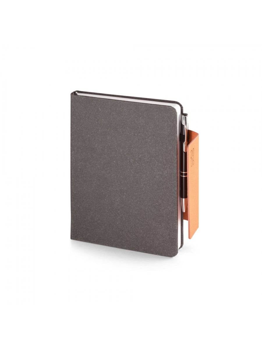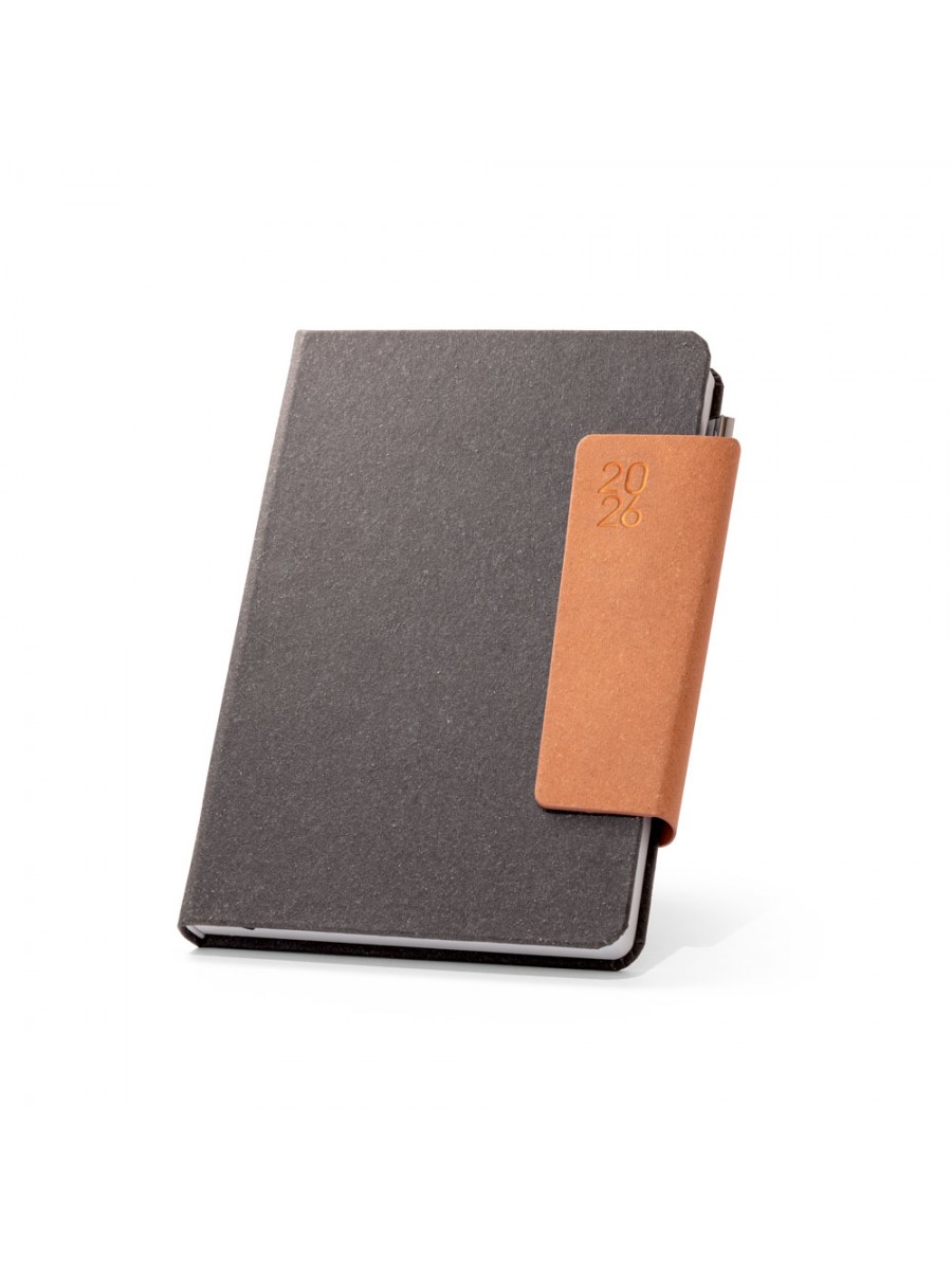 A5 diary in leather (58% recycled) with magnetic closure. It has a ballpoint holder (included) and ribbon marker. It is organised in a daily plan, with pages (70 g/m²) made from FSC™ certified material and other controlled materials. Supplied with a non-woven pouch. 148 x 210 mm | Pouch: 205 x 250 mm