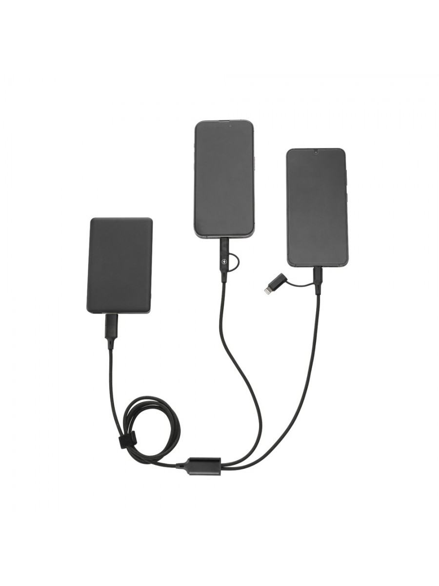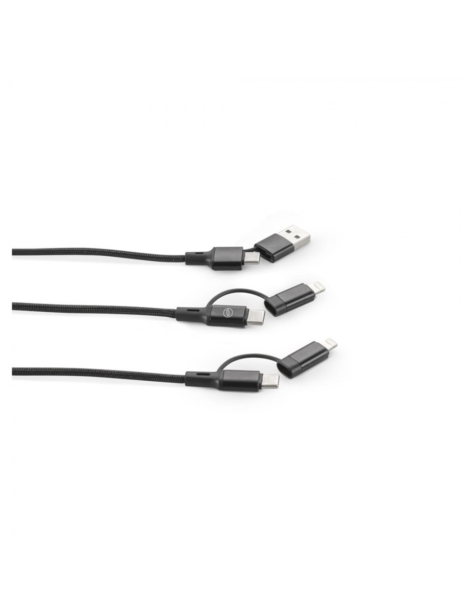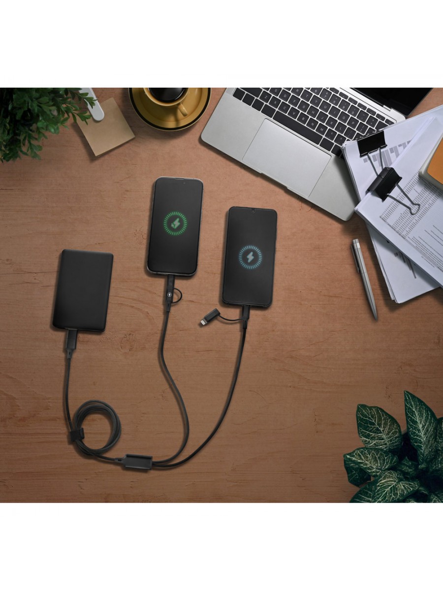 Cavo 6-in-1 super veloce per ricaricare fino a due dispositivi contemporaneamente. Un cavo versatile e pratico con le principali entrate e uscite necessarie quotidianamente.Materiale: alluminio riciclato (20% rAL) e PET riciclato (4% rPET)Funzionalità: ricarica super veloce e trasferimento datiIngressi: USB-C e USB-AUscita 1: USB-C (60W) e Lightning (27W)Uscita 2: USB-C (10W), Lightning o MicroUSB (10W)Confezione: scatola regalo in carta kraft riciclata. PET riciclato (rPET)