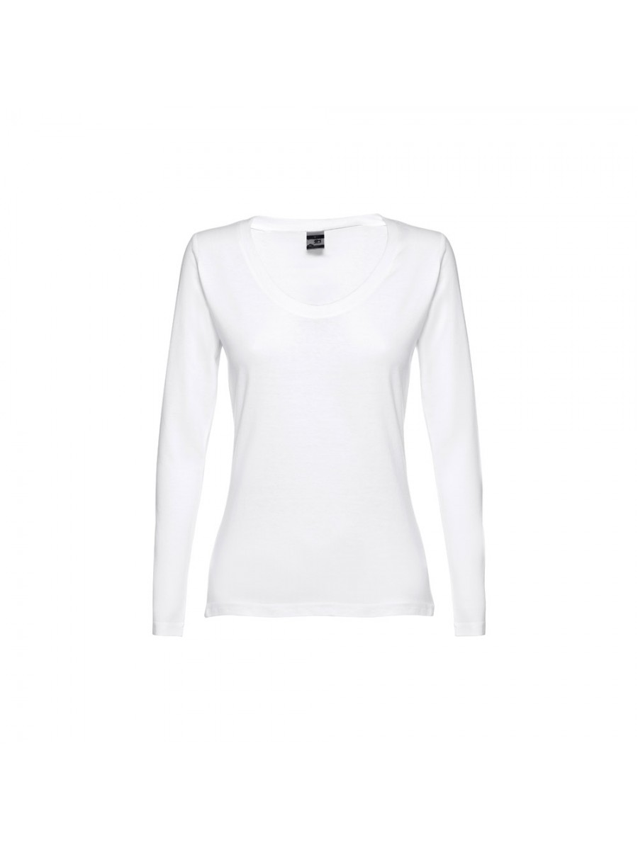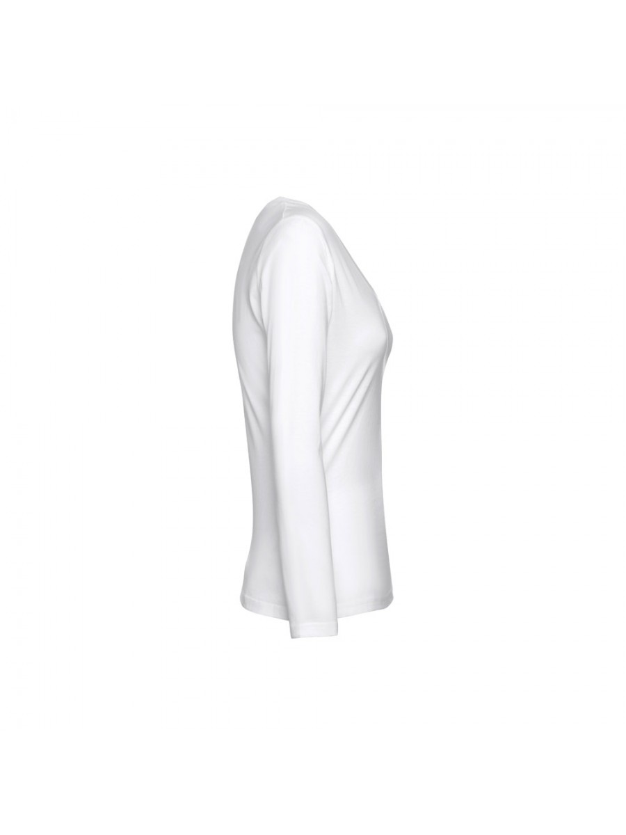 T-shirt a manica lunga da donna in jersey 100% cotone (150 g/m²) con filo di cotone cardato. Taglio moderno, colletto con nastro di rinforzo in jersey. T-shirt tubolare con taglio regolare e cucitura doppia su maniche e parte inferiore. Taglie: S, M, L, XL, XXL