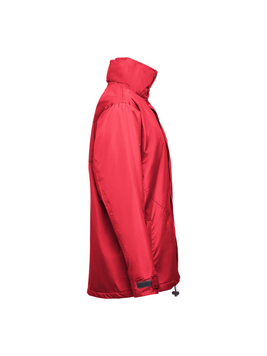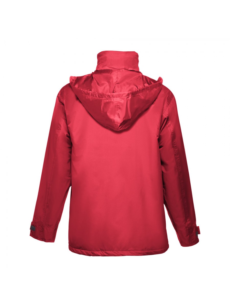 Parka (unisex) imbottito in 100% poliestere (esterno: 240g/m² 100% poliestere pongee 240 e rivestimento impermeabile in PVC, interno: 65g/m² 100% poliestere taffetà, Riempimento: 100% poliestere 80 g/m²). Girocollo foderato in pile nero (chiusura in velcro). Cappuccio pieghevole sul collo, regolabile tramite coulisse con stoppers neri. Apertura, chiusura in tinta, strappo e bottoni a pressione neri. 2 tasche esterne con pattina e 2 tasche interne (1 per cellulare) con chiusura a strappo. Polsini interni a costine 2x2 e polsini esterni regolabili con chiusura a strappo. Cuciture termosaldate. Accesso posteriore con cerniera per una facile personalizzazione. Taglie: XS, S, M, L, XL, XXL