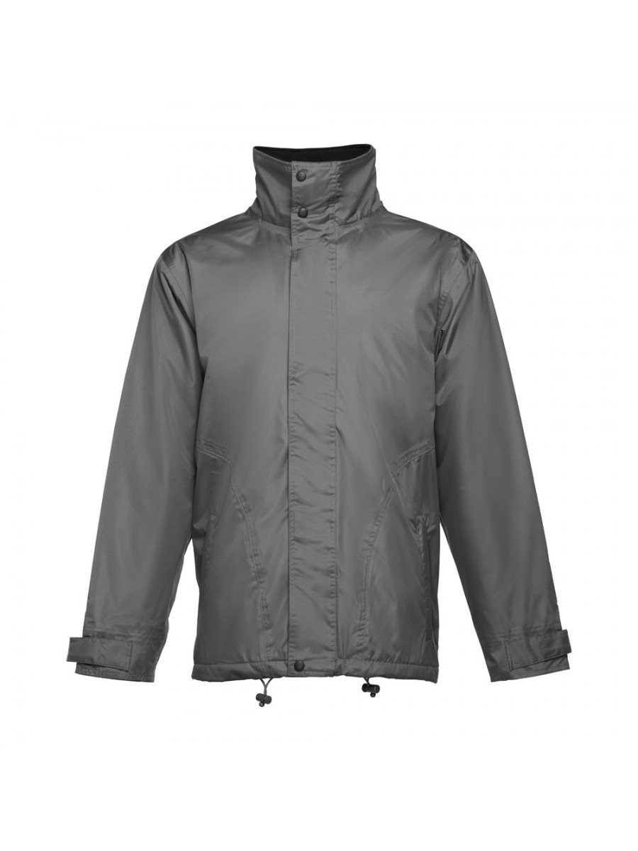 Parka (unisex) imbottito in 100% poliestere (esterno: 240g/m² 100% poliestere pongee 240 e rivestimento impermeabile in PVC, interno: 65g/m² 100% poliestere taffetà, Riempimento: 100% poliestere 80 g/m²). Girocollo foderato in pile nero (chiusura in velcro). Cappuccio pieghevole sul collo, regolabile tramite coulisse con stoppers neri. Apertura, chiusura in tinta, strappo e bottoni a pressione neri. 2 tasche esterne con pattina e 2 tasche interne (1 per cellulare) con chiusura a strappo. Polsini interni a costine 2x2 e polsini esterni regolabili con chiusura a strappo. Cuciture termosaldate. Accesso posteriore con cerniera per una facile personalizzazione. Taglie: XS, S, M, L, XL, XXL