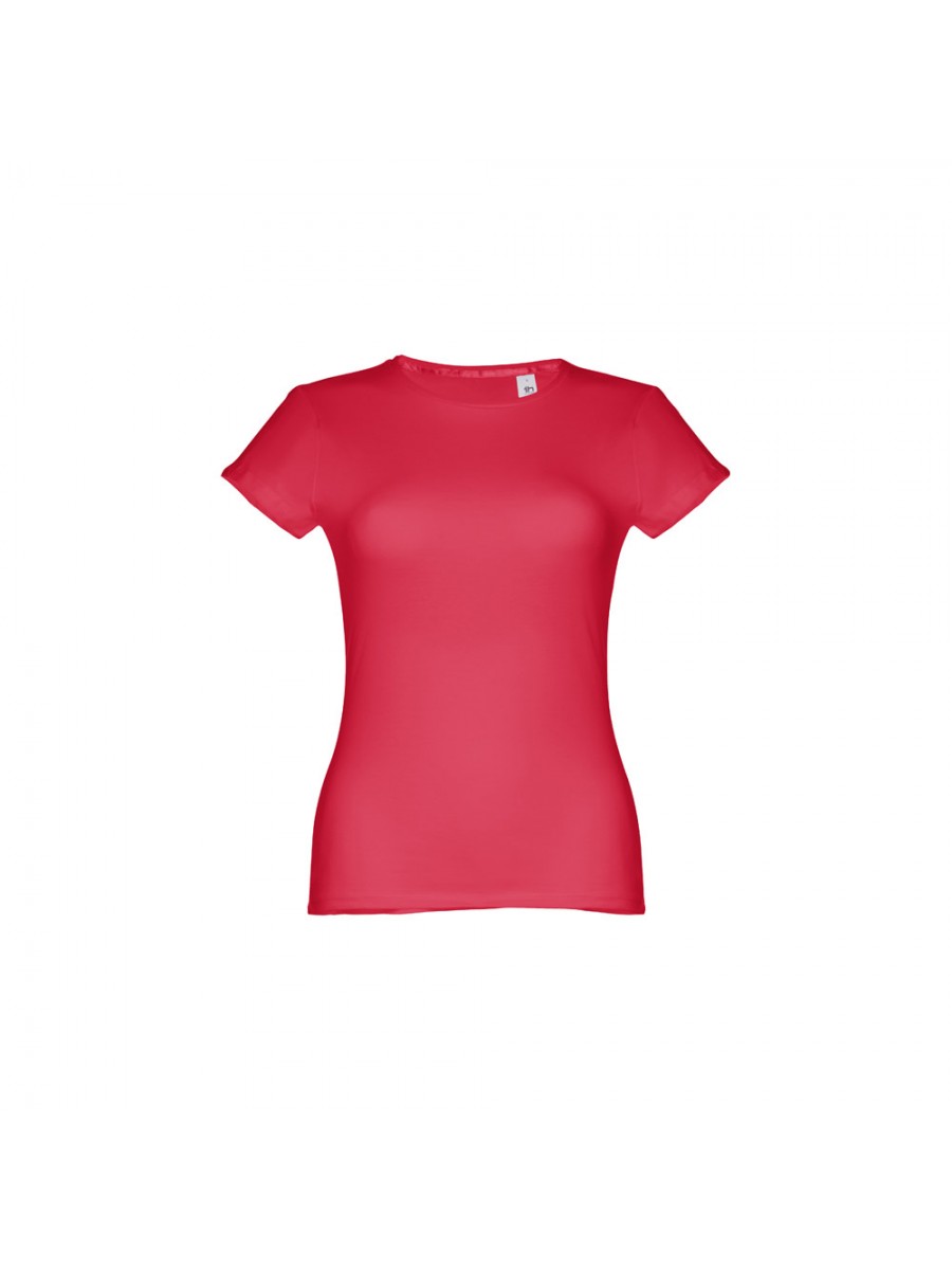 T-shirt aderente da donna in jersey di cotone 100% (150 g/m²) con filo in cotone cardato (colore: 183 90% cotone/10% viscosa, colore 196: 98% cotone/2% viscosa). Girocollo sottile in jersey con nastro di rinforzo in raso. Cuciture ribattute doppie sulle maniche e sull'orlo inferiore. Taglie: S, M, L, XL, XXL
